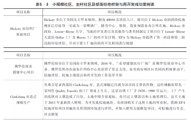 面临棘手的棕地问题,小规模的城市、社区、乡村与大城市相比往往更加缺乏足够的资金支持和技术支撑。EPA的棕地项目能够为规模较小的社区、农村社区及部落提供资金、技术方面的支持,帮助上述社区推进棕地的土地清洁和再开发工作。2010~2017年,EPA为超过2200个社区提供了棕地复兴支持资金。从图5-4的基金申请成功率来看,不同规模的社区都有较高概率能够成功获得EPA的支持和帮助。在EPA及其他基金或组织的支持下,小规模社区、农村社区及部落成功实现了棕地的修复与再开发,使棕地重新以商业用地、居住用地及农业用地等形态运作,发挥了促进经济增长、推动社会发展、增加就业机会等多方面的作用。表5-3列举了土壤钻机5个成功的小规模社区、农村社区及部落的棕地修复及再开发案例。