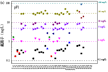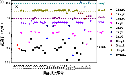 目前常用的氟化物测定方法包括《水质 无机阴离子(F-、Cl-、NO2-、Br-、NO3-、PO43-、SO32-、SO42-)的测定 离子色谱法》(HJ/T 84-2016)、《水质 氟化物的测定 离子选择电极法》(GB 7484-87)、《水质 氟化物的测定 氟试剂分光光度法》(HJ 488-2009)、《土壤 水溶性氟化物和总氟化物的测定 离子选择电极法》(HJ 873-2017)和《固体废物 氟的测定 碱熔-离子选择电极法》(HJ 999-2018)等。土壤氟污染修复中常用氟离子选择电极法和离子色谱法两种。其中,氟离子选择电极法是测定氟含量的有效方法,土壤钻机由于操作简便、快速、适用范围宽等而被广泛应用。在实际氟污染土壤修复项目中,确保检测结果的稳定性及准确性是非常必要的,而氟离子选择电极法的准确性及精确度好坏,直接影响测定结果的准确性。用标准物质做氟离子选择法的准确性及精确度分析,优先确定仪器本身的准确性和精确度、测定人员操作误差问题、氟离子选择电极法的适用范围等。如图2所示,针对不同项目-批次(如1-1:项目1-土样1)的土壤氟污染修复小试试验,用不同浓度的氟标准物质做氟离子选择法的准确性及精确度分析。图2a和图2b分别为两种不同型号氟离子选择电极(pF1和pF2)测定结果,最低检出限为0.05 mg/L,当氟标准液浓度较低(< 1mg/L)时,氟离子测定浓度分布于0.1~1 mg/L之间,当氟标准液浓度为1 mg/L、5 mg/L、10 mg/L、30 mg/L时,氟离子测定结果在标准线附近离散分布。图2c为离子色谱法(IC)测定结果,最低检出限为0.006 mg/L,当氟标准液浓度较低(<1mg/L)时,氟离子测定结果稳定性较差,且0.1 mg/L的氟标准液检测结果为0,当氟标准液浓度为1 mg/L、5 mg/L、10 mg/L、30 mg/L时,氟离子测定结果稳定性较好。所以,土壤氟污染修复中,需要根据实际项目需求选择合适的测定方法。实际项目时间比较紧急,氟修复目标较低(≤1 mg/L)时,可优先考虑使用氟离子选择电极法进行氟化物的测定。此外,氟离子选择电极法的准确性和精确度受许多环境因素的影响,如pH值、温度、响应时间及总离子强度缓冲液等。