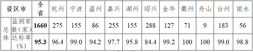 各设区市中,杭州、绍兴和金华有所下降,降幅为0.5-0.9个百分点;其余各市均有所上升,升幅为0.2-6.3个百分点。各主要行业中酒、饮料和精制茶制造业和电力、热力生产和供应业达标率持平;金属制造业、食品制造业和皮革、毛皮、羽毛及其制品和制鞋业有所下降,降幅为1.4-5.0个百分点;其余各行业均有所上升,升幅为0.2-10.7个百分点。