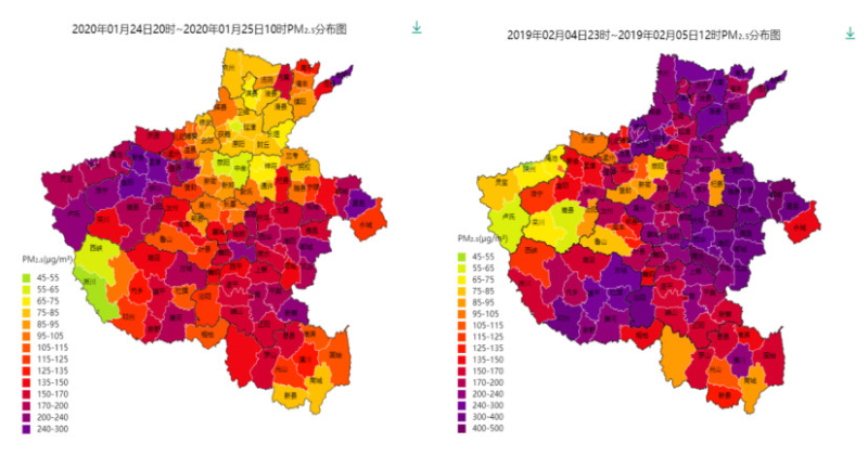 2020年春节期间:受大雾和高压前锋传输双重影响,23日20时至除夕(24日)上午,全省除南部信阳、驻马店、许昌、漯河和周口外,均出现重度或严重污染,峰值出现在安阳,PM2.5小时浓度高达 508 微克/立方米。随着冷空气来临,除夕下午,全省空气质量逐步改善。在除夕夜里20时至初一早上7时传统燃放烟花爆竹的高峰期,由于全省实施烟花爆竹禁燃禁放措施,空气质量得到明显改善,全省PM2.5平均浓度由214微克/立方米降至116微克/立方米,下降98微克/立方米,下降幅度达45.7%;与未燃放烟花爆竹时段相比,在极端不利气象条件下,17个省辖市及济源示范区仅有4市PM2.5浓度有所上升,上升幅度均未超过100微克/立方米,未出现爆表现象。