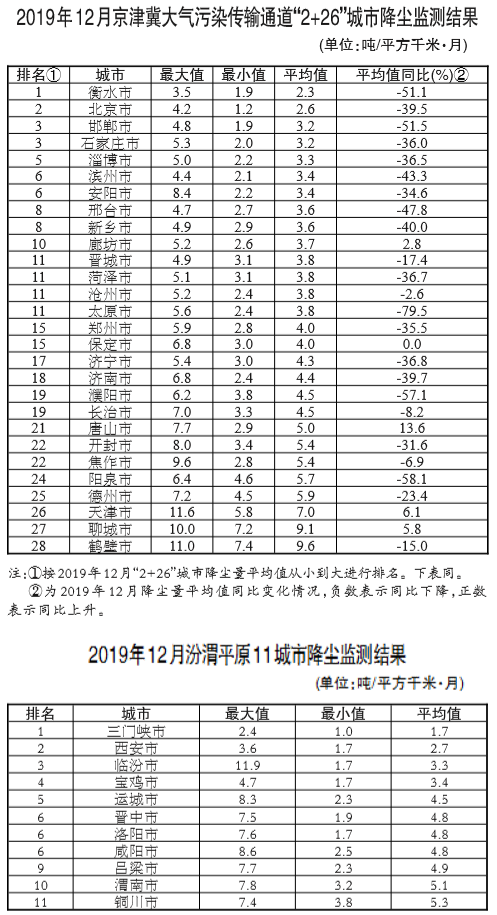 摘要 : cj生态环境部近日向媒体公布了2019年12月京津冀大气污染传输通道“2+26”城市(以下简称“2+26”城市)和汾渭平原11城市降尘监测结果。