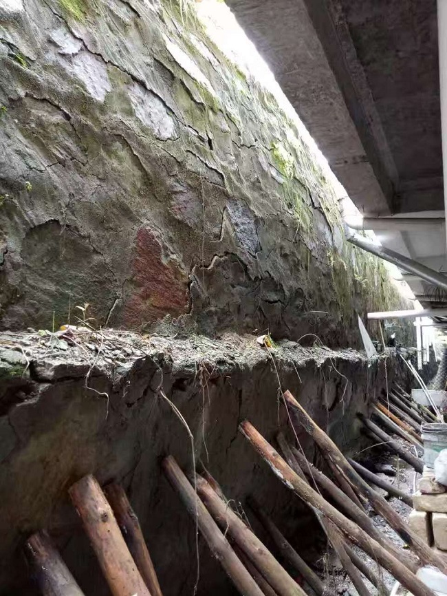 记者在现场看到,整个墙体呈梯形结构向上延展,大约3米多高,护住了山体向下继续崩塌。记者随太湖县自然资源和规划局的工作人员爬上山坡,眼前几道相连在一起的草字头形状钢筋混凝土“蛤蟆桩”卯在半山腰上,与下面的防护墙相互作用,形成了坚实稳固山体的安全防护网格。