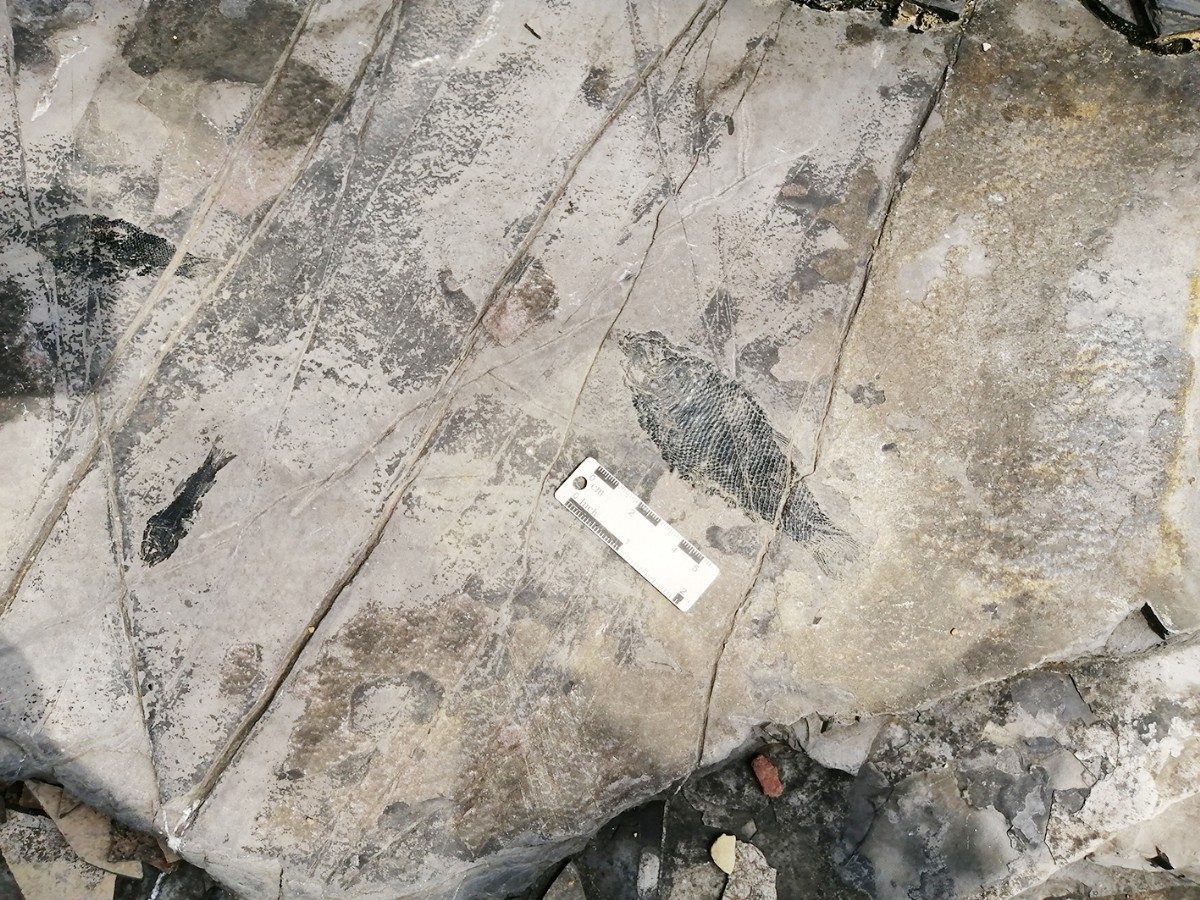 当天下午,记者随成都地调中心的专家们参观了馆藏于罗平县自然资源局大院内的数千块精美化石标本,并来到了化石采集3号采场。这个巨大层状结构的岩层采场,脚下随便一迈,都能踩住生物化石,地质锤随便一敲,都能敲出一块生物化石来——这里简直是一本巨大的生物化石教科书。随后,一行人又赶到首次发现龙鱼化石的1号采场,在那里又找到了几块化石标本。
