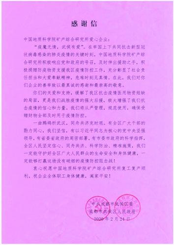 摘要 : 11中共成都市武侯区委、武侯区人民政府近日向自然资源部中国地质调查局成都矿产综合利用研究所发来感谢信,对该所在新冠肺炎疫情防控的关键时刻