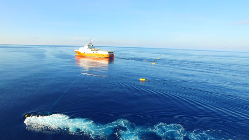多道地震作业是航次的重头戏。7月12日,“海洋地质八号”驶达珠江口外海域细担岛南面工区后开始作业演示,调查作业人员身着橘黄色帆布工作服,穿戴好安全设施,实施现场作业。将尾标、电缆、水鸟等等依次排放入海后,再启动气枪震源,“放炮”,收集地震信号。其他参航单位人员也同样身着工作服、安全帽、工作鞋等,在甲板两侧近距离观摩,现场研讨。三维地震的海上试验从设备下水、监测、地震试验、接收地震信号及回收,耗时12小时。韦成龙介绍,如果到更远的海区开展正常作业时,一般需要排放4条缆,仅水下设备布设就需要48小时。
