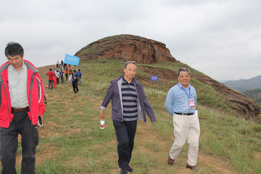 专家在安塞王家湾石寨山丹霞地貌区考察 地调局副总工徐学义(中),地大副校长王训练(右)