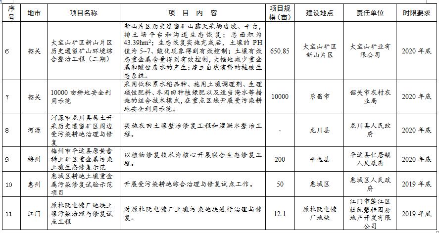 (十二)加强污染地块治理与修复。以拟开发建设居住、商业、学校、医疗和养老机构等项目的污染地块为重点,开展治理与修复,防范土壤环境风险。进一步推进和规范土壤污染治理与修复技术应用试点项目,及时总结试点经验。韶关市要加快推进大宝山矿区新山片区历史遗留矿山环境综合整治工程(二期)、石人嶂尾矿库生态恢复工程(二期)、曲江区梅花河流域历史遗留污染地块整治(一期)等土壤污染综合防治重点项目。(省生态环境厅牵头,省自然资源厅、住房城乡建设厅、地质局等参与)