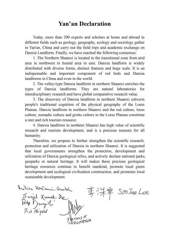 今天,在第四届红层与丹霞地貌国际研讨会暨第十九届全国红层与丹霞地貌学术讨论会上,来自国内外200多位地理、地质、生态以及社会学界的专家学者,聚集在中国延安开展了野外考察和学术研讨,形成以下共识: