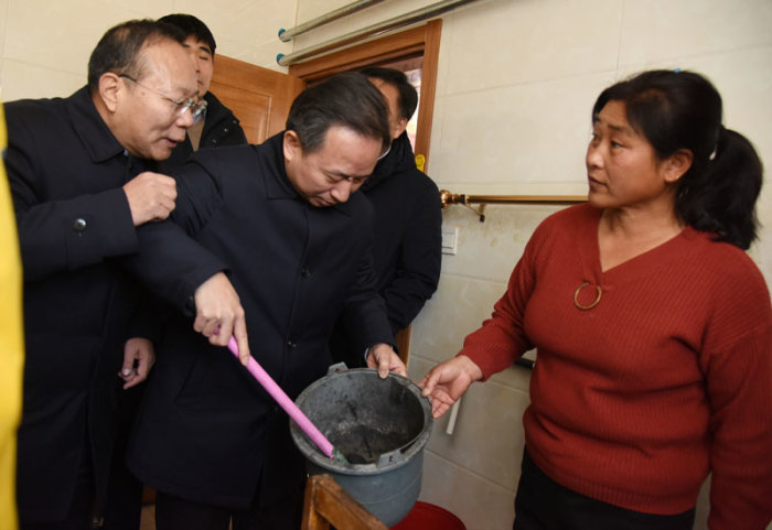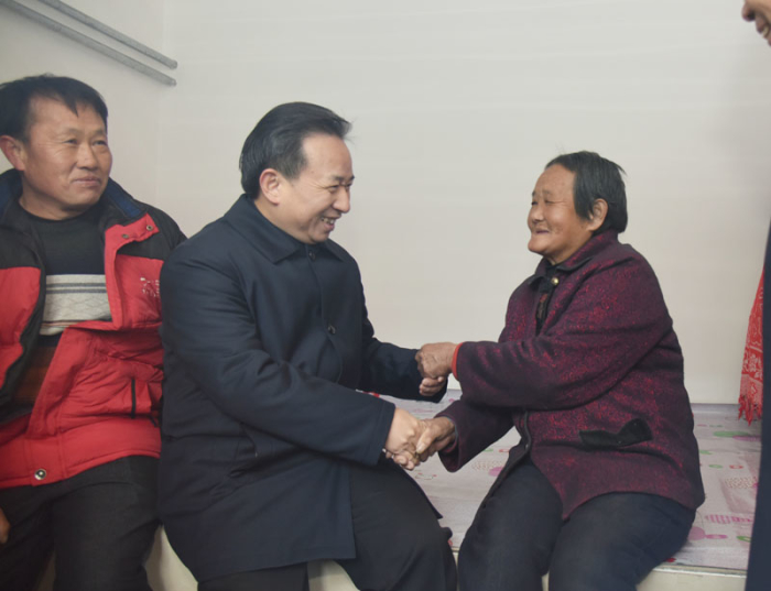海字村易地扶贫搬迁任务占全乡的50%,新民区作为安置地之一,配置了污水管网集中处理系统,“上水有管,下水有道”极大提升了村民的生活幸福感。搬迁户孙桂荣老人激动地对李干杰说,“新家真不赖!暖和又干净。感谢共产党,感谢国家!”李干杰详细询问孙桂荣搬迁后的生活收入来源和医疗报销等情况,并查看屋内取暖设备,叮嘱老人保重身体。