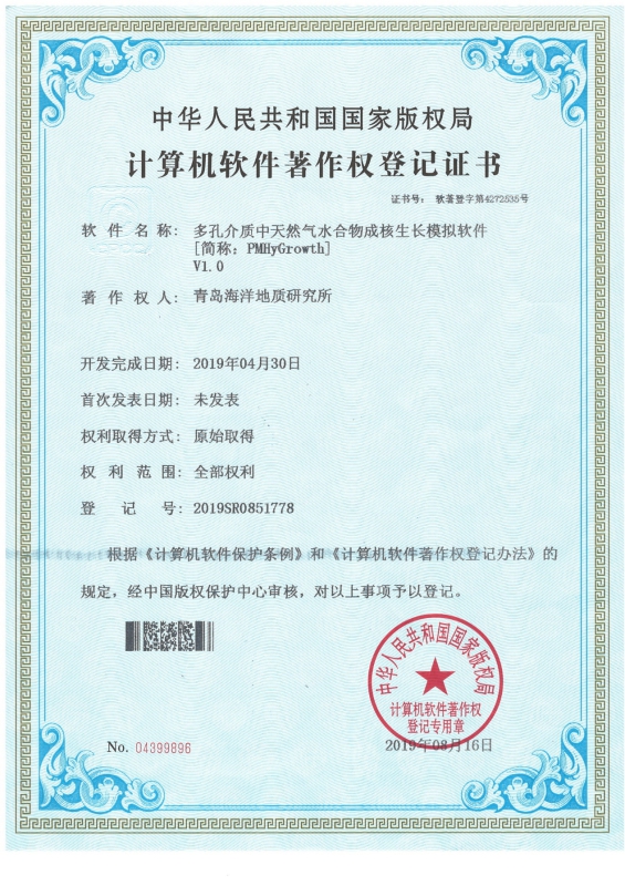 摘要 : 20 近日,由自然资源部中国地质调查局青岛海洋地质研究所自主开发,并拥有独立知识产权的“多孔介质中天然气水合物成核生长模拟软件”获得国家版权局软件著作权登记证书,登记号为2019SR0851778。