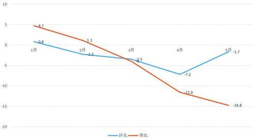 从采掘工业细分行业看,煤炭开采和洗选业价格环比下降2.9%,同比下降8.8%,1-5月平均同比下降5.2%;石油和天然气开采业价格环比下降9.1%,同比下降57.6%,1-5月平均同比下降24.5%;黑色金属矿采选业价格环比上涨0.1%,同比上涨2.2%,1-5月平均同比上涨5.8%;有色金属矿采选业价格环比上涨1.6%,同比上涨2.6%,1-5月平均同比上涨2.9%;非金属矿采选业价格环比上涨0.6%,同比上涨1.8%,1-5月平均同比上涨1.8%。