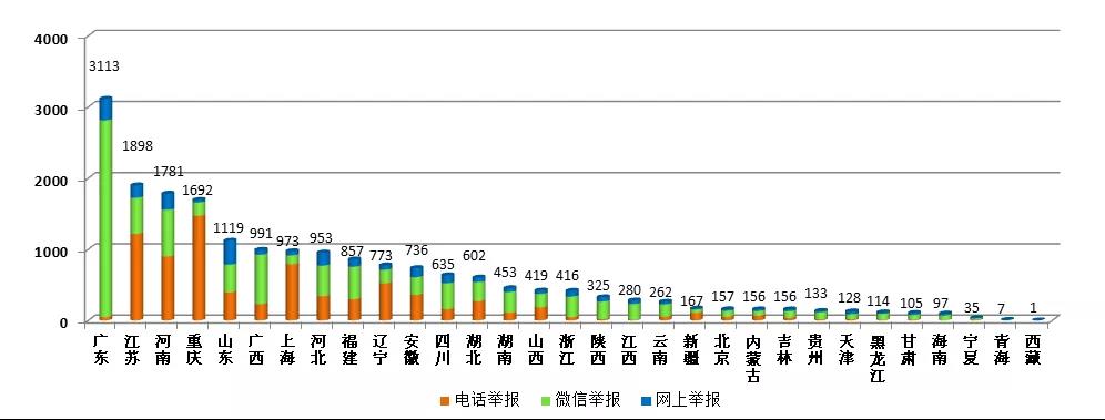 从各地区不同渠道举报数量看,广东、江苏、河南等地举报总量居前,重庆、上海、江苏等地电话举报占比较高,广东、广西、浙江等地微信举报占比较高。