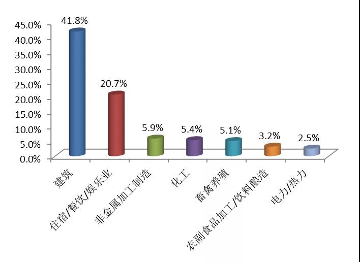 从行业类型来看,1月公众反映最集中的行业仍是建筑业,占41.8%,其次为住宿餐饮娱乐业和非金属加工制造,分别占20.7%和5.9%。其中,建筑业占比环比下降1.6个百分点,住宿/餐饮/娱乐业和畜禽养殖业举报占比环比均上升2个百分点,非金属加工制造业举报下降1.8个百分点。