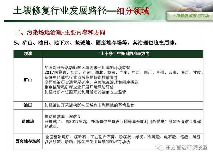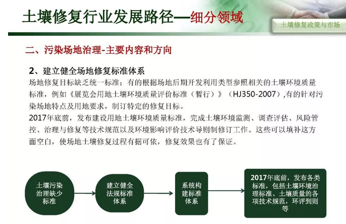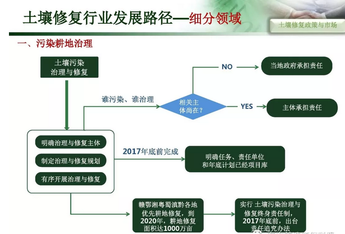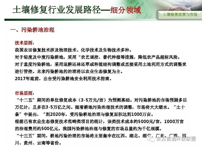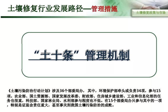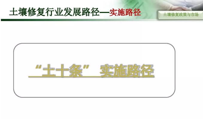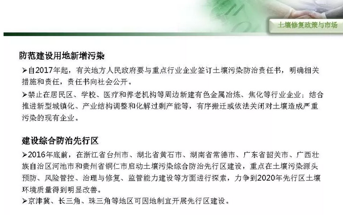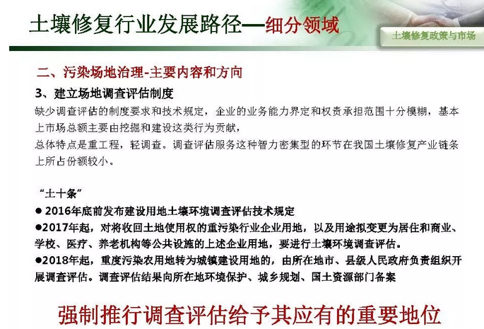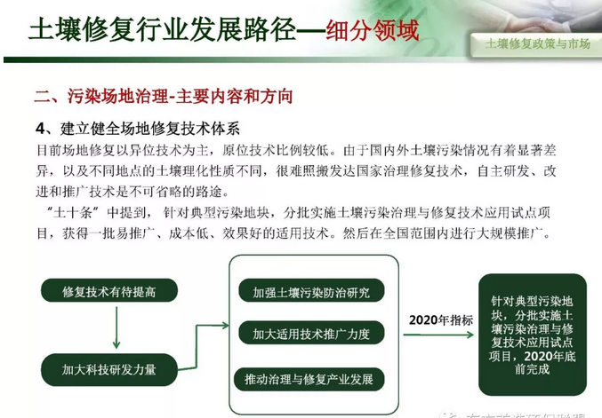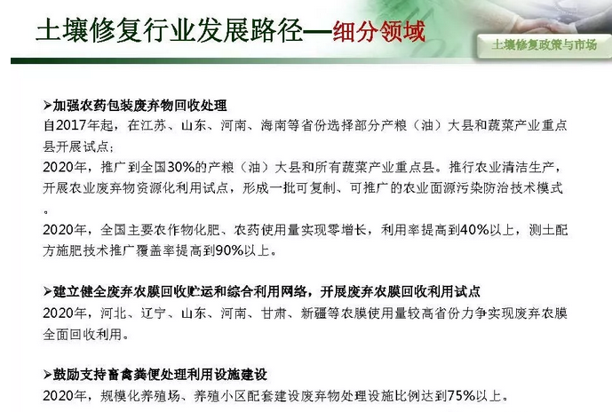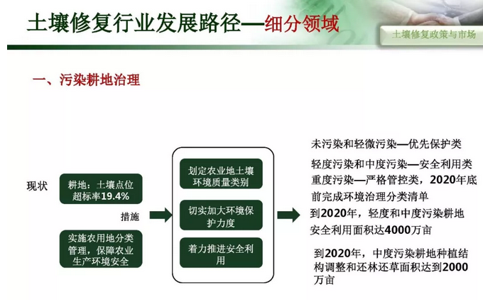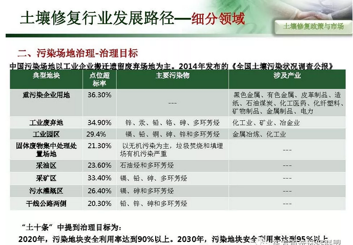 摘要 : 6“土十条” 下土壤修复行业发展路径,“土十条”下我国土壤治理的目标是到2020年,土壤环境质量总体保持稳定,农用地和建设用地土壤环境安全得到基本保障,土壤环境风险得到基本管控;到2030年,全国土壤环境质量稳中向好,农用地和建筑用地土壤环境安全得到有效保障,土壤环境风险得到全面管控。