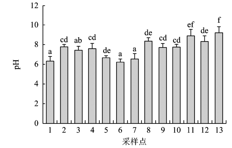 13个采样点表层土壤pH和有机质浓度变化见图3。由图3可知,3种类型草场土壤pH为6.25~9.20。高寒沼泽草场的采样点1土壤pH最小,与高寒山地草甸差异不显著(P>0.05),与其他采样点间差异显著(P<0.05);高寒草甸草场中,土壤退化程度越大土壤pH越大,高寒盐碱化荒漠pH最大,与各采样点土壤pH差异显著(P<0.05)。