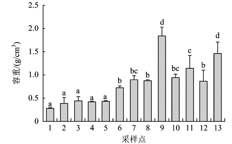 13个采样点表层土壤容重及含水率变化见图2。由图2可知,3种类型草场表层土壤容重表现为高寒草甸草场>高寒草原草场>高寒沼泽草场,且高寒草甸草场与其他2种草场间差异显著。高寒沼泽草场、高寒草原草场在围封、适度放牧、轻度放牧状态下草场土壤基本无退化,其各采样点土壤容重较小,其中高寒沼泽草场的采样点1土壤容重最小,且与高寒草原草场各采样点土壤容重差异不显著(P>0.05);高寒草甸草场在中度放牧状态下,土壤容重差异不显著,但与重度放牧状态下土壤容重差异显著(P<0.05);重度退化的高寒沙丘沙化草甸土壤容重最大,与重度退化的高寒盐碱化荒漠差异不显著(P>0.05),与其他生境土壤容重差异显著(P<0.05);高寒沙丘沙化草甸采样点中,重度退化的采样点9较中度退化的采样点8土壤容重增加了0.97 g/cm3;高寒盐碱化荒漠的2个采样点之间差异显著。