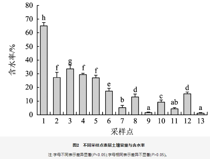 13个采样点表层土壤含水率为1.42%~64.96%,不同采样点表层土壤含水率差异显著。3种类型草场表层土壤含水率表现为高寒沼泽草场>高寒草原草场>高寒草甸草场,且差异显著。高寒沼泽草场的采样点1土壤含水率最大,且与其他采样点差异显著(P<0.05);高寒草原草场各采样点中,除采样点3土壤含水率稍高外,其他各采样点差异不显著(P>0.05);高寒草甸草场中,重度退化的高寒砂砾质荒漠与重度退化的高寒盐碱化荒漠草甸土壤含水率最小,二者差异不显著(P>0.05),但与其他各采样点土壤含水率差异显著(P<0.05)。