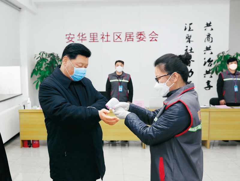 2020年2月10日,中共中央总书记、国家主席、中央军委主席习近平在北京调研指导新冠肺炎疫情防控工作。这是习近平在朝阳区安贞街道安华里社区,了解基层一线疫情联防联控情况。新华社记者 庞兴雷/摄