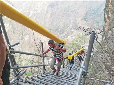 垂直高差近千米,2600多级钢梯台阶,往返一次需要五六个小时,负责项目建设的中国地质调查局探矿工艺研究所高级工程师王佃明如数家珍。“最难的就是安装材料的搬运,因为没有路可以抵达,所有的材料都必须靠人工搬运。为了方便人力搬运,我们还做过一些改进,比如安装GNSS的钢管,一般都有5到6米长,我们就想办法把它改成为两段,搬上山后再用法兰连接,但长度也有2到3米。还有一些设备比较重,得几个人一起接力才能抬到山上去,上‘天梯’就非常辛苦,也很不安全。像工程建设中最常见的袋装水泥,购买一袋的价格也到不了50元,可是把它搬上山,光搬运费就高达400元,即使是生活在阿土列尔村两个壮劳力一天也只能靠接力才能扛一袋上山。以往实施的工程中,运输费用都不到工程总费用的5%,在这个项目中却是这个比例的好几倍甚至十几倍。”