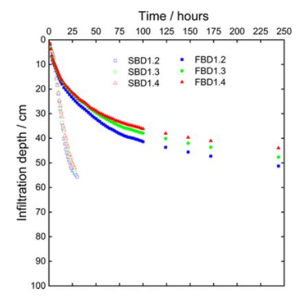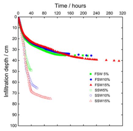 图1.咸水结冰融水入渗在不同初始含水量和容重滨海盐土中的入渗过程