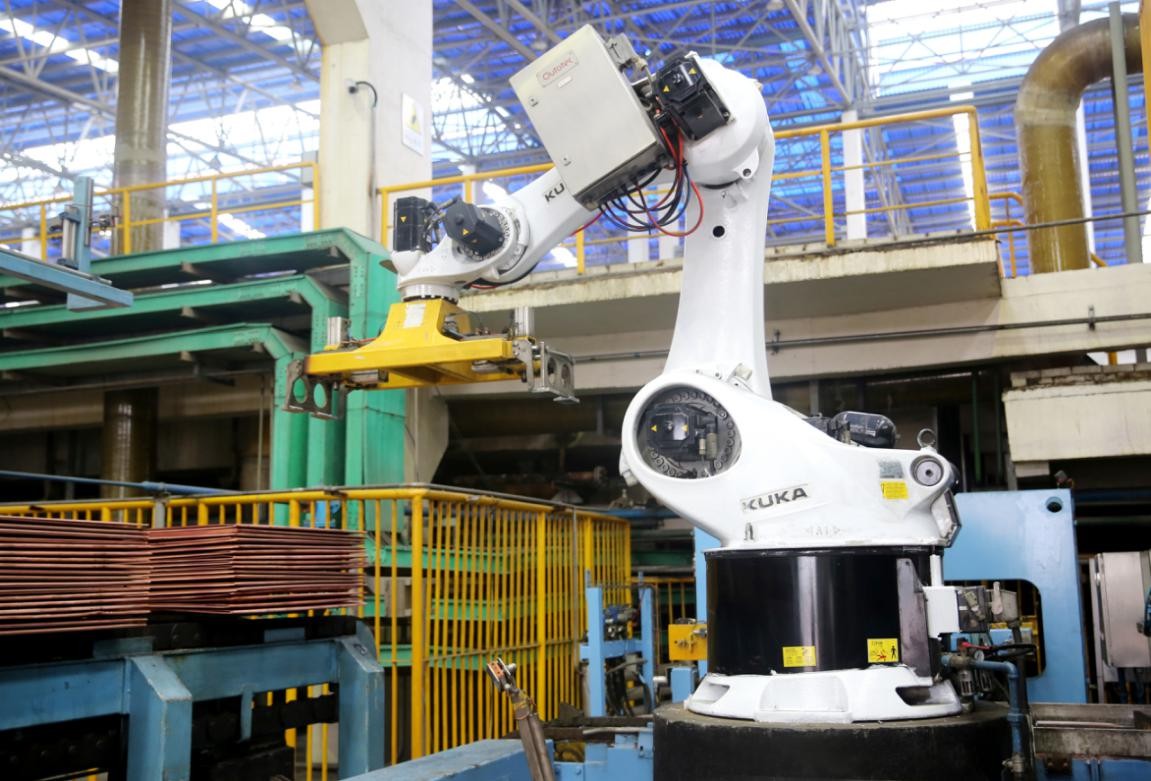 中国黄金集团中原冶炼厂已成为亚洲最大的黄金综合回收基地。图为中原冶炼厂自动剥板机器人