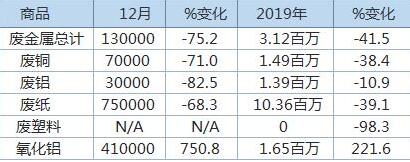 摘要 : cjSMM网讯:海关总署周四公布的数据显示,中国2019年废金属进口量较上年减少41.5%,12月进口量大幅缩水75.2%,因全球最大的金属消费国继续减少海外固体废料的进口。