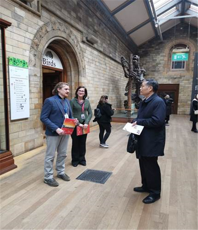 在访问自然历史博物馆期间,博物馆地学部负责人介绍了该馆地学部分的概要情况,双方就利用2020郴州国际矿物晶体博览会和2020 中国国际矿业大会平台进行矿业文化历史交流达成共识。